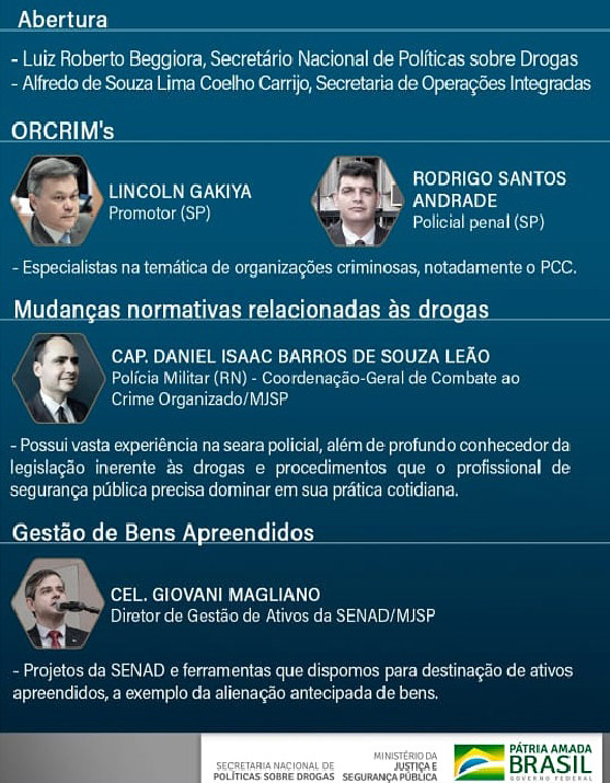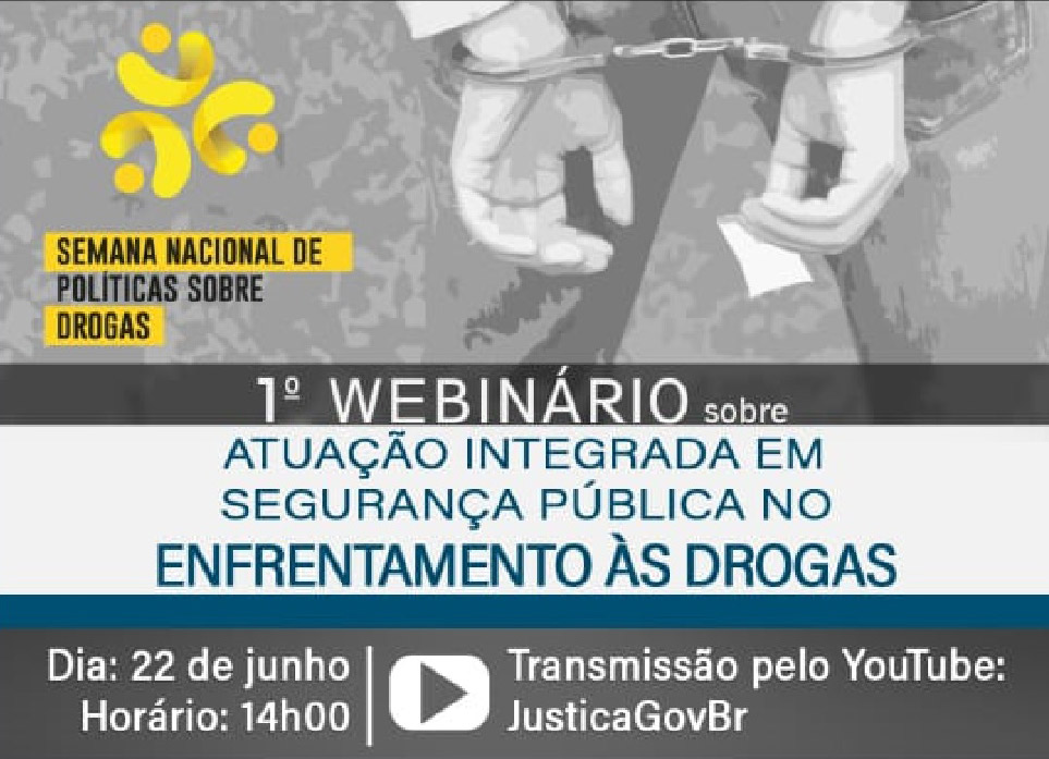 O Webinário foi transmitido no dia 22 de junho, às 14h, no canal oficial do Ministério da Justiça e Segurança Pública em https://www.youtube.com/user/JusticaGovBR. O seminário também abordou mudanças normativas relacionadas às drogas, bem como gestão de bens apreendidos e destinou-se aos profissionais da segurança pública e demais interessados em aprofundar conhecimentos e somar esforços para encarar os desafios dessa seara.