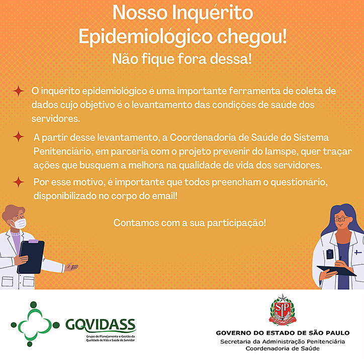 Convidamos todos os servidores e servidoras da Secretaria da Administração Penitenciária a preencherem o Inquérito Epidemiológico até o dia 30/06/2022, às 17h. Se você não recebeu o link no seu email ou não possui email institucional, procure a CIPA do seu local de trabalho para que possa realizar o preenchimento.