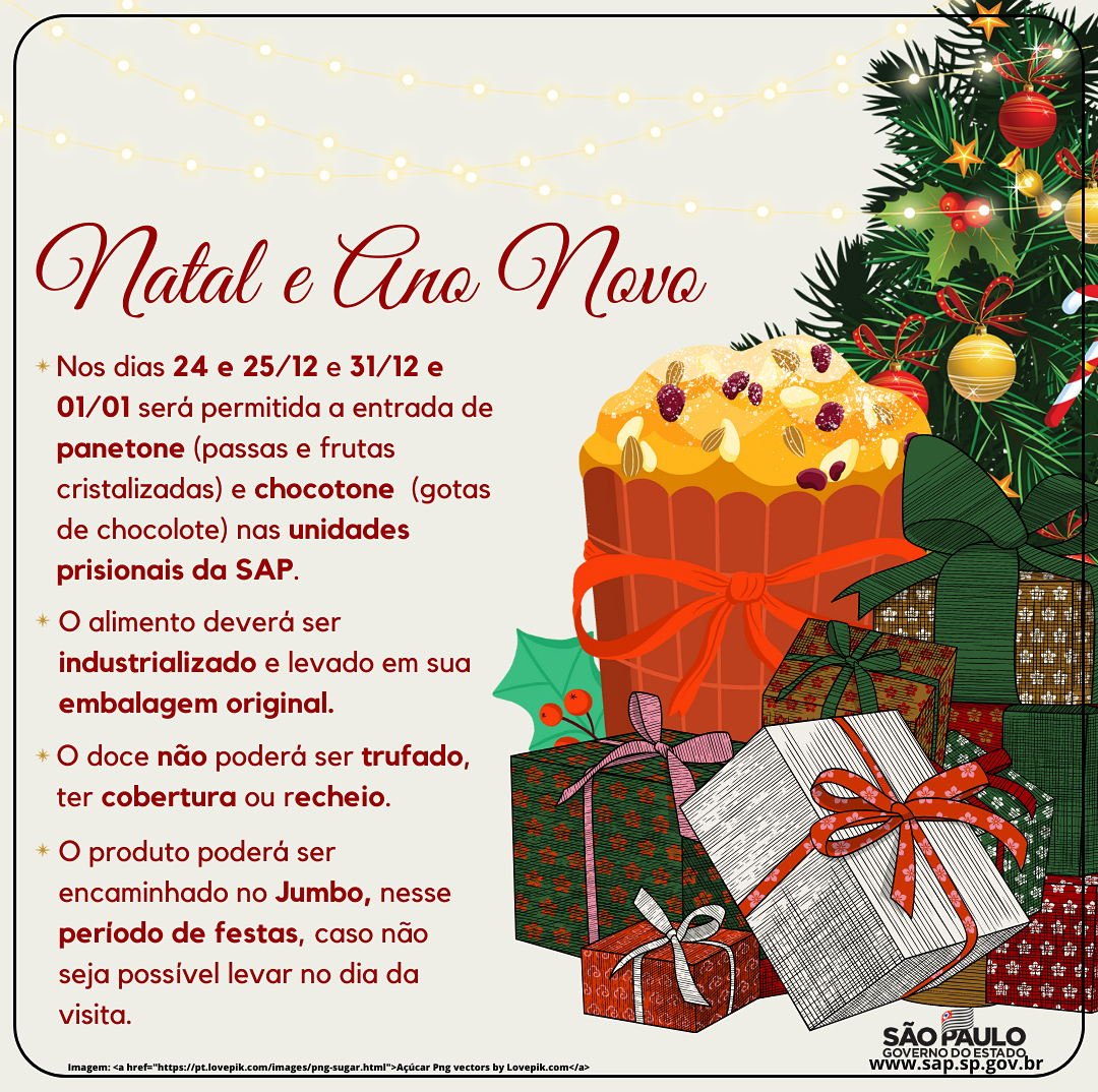 🥮 A Secretaria da Administração Penitenciária informa que será permitida a entrada de panetone ou chocotone de até 500g para ser entregue ao preso. Confiram as regras que constam no quadro e não esqueçam que o produto precisa ser industrializado. Não pode ser caseiro, trufado ou recheado.