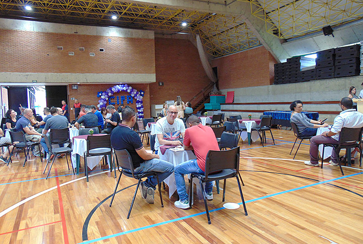 Os presentes ainda foram envolvidos em uma divertida gincana com diversas dinâmicas. Separados em times com camisas de cores diferentes, os participantes competiram na dança das cadeiras, adivinhação por mímica e perguntas de conhecimentos gerais com torta na cara.