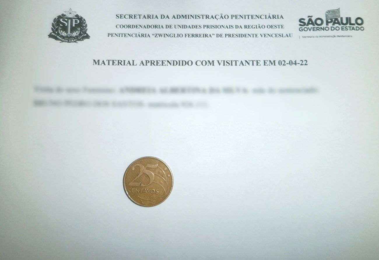 No último sábado (02/04), ao passar pelo detector de metais na PI de Presidente Venceslau, a mãe de um sentenciado foi surpreendida ao perceber que o aparelho detectou em seu corpo um objeto de metal. De imediato, ela retirou do top que vestia uma moeda de R$ 0,25 centavos. Por ser objeto proibido de entrar na unidade prisional, a mulher foi suspensa do rol de visitas e o sentenciado responderá a Procedimento Disciplinar.