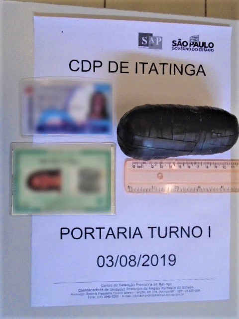 Uma mulher foi flagrada tentando entrar no Centro de Detenção Provisória (CDP) de Itatinga com 134g de maconha em sua vagina, durante procedimento de revista pelo escâner corporal, por volta das 9h35 de sábado, dia 03/08. Inicialmente, a visitante negou qualquer irregularidade. Mas, ao saber que seria encaminhada ao hospital para exames, retirou de sua genitália a droga embalada em fita adesiva. Ela negou, entretanto, que entregaria o entorpecente para o marido preso. Disse que tentava entrar com maconha na unidade prisional para pagar uma dívida com outra visitante.