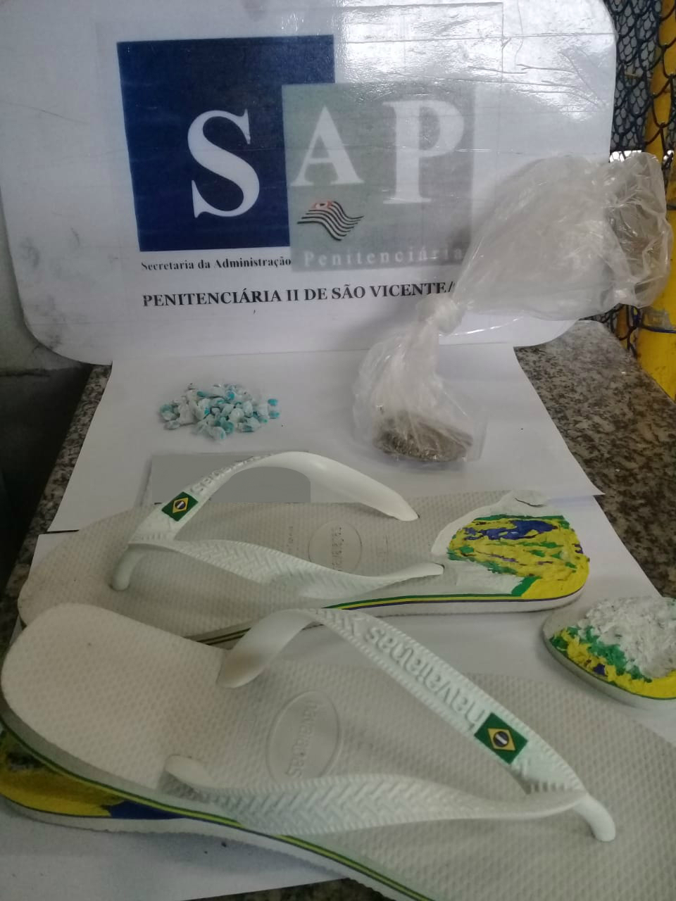 Duas mulheres foram barradas ao tentar entrar com drogas dentro de chinelos na Penitenciária 2 de São Vicente no sábado, dia 03/08. Ao todo, foram apreendidos mais de 50g de entorpecentes, 80 comprimidos de estimulante sexual e um pedaço de folha de maconha sintética, popularmente conhecida como K4. Quando os pertences das visitantes foram inspecionados, os servidores perceberam que dois pares de chinelo tinham sido cortados ao meio e colados novamente. Os calçados, então, foram revistados pelo aparelho de raio-X e foi confirmado que havia ilícitos em seu interior. Quando abertos, foram encontrados 35g de cocaína, uma folha de K4, além de 7 pílulas de estimulante sexual em um dos pares e 18g de maconha mais 73 comprimidos do estimulante em outro. As suspeitas, de 28 e de 42 anos, são companheiras de sentenciados do estabelecimento penal.