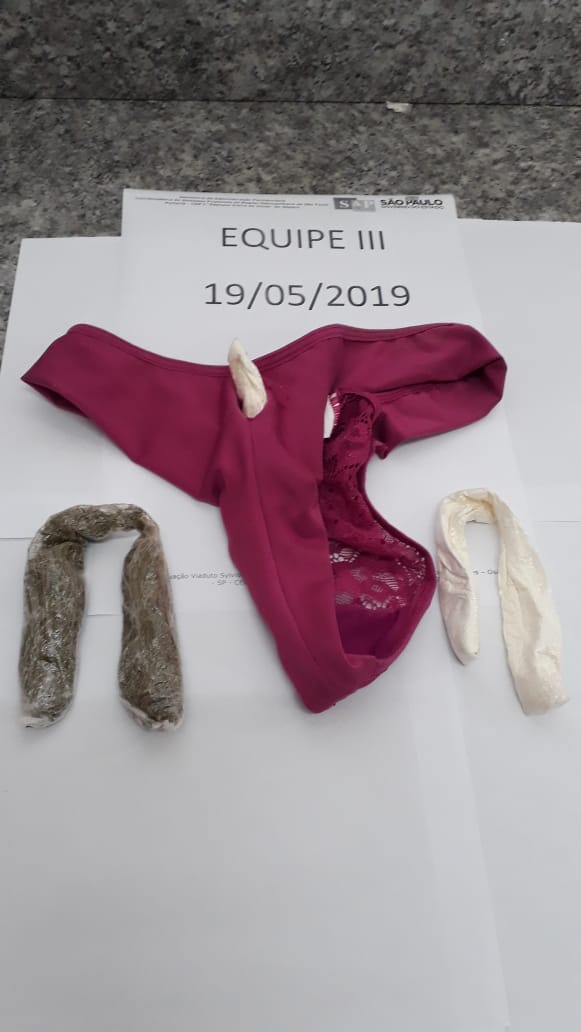 No Centro de Detenção Provisória (CDP) de Suzano uma mulher tentou burlar as regras, mas foi pega pelas servidoras do Estado com drogas escondidas na roupa íntima, no domingo, dia 19/05. O entorpecente seria entregue a seu irmão, recluso na unidade. Por volta das 10h, um visitante, de 19 anos, foi submetido à revista por meio de escaneamento corporal, quando foi identificado um objeto estranho na região pélvica do jovem. O rapaz trazia 72,1g de maconha e 98,3g de cocaína no forro de sua cueca.
