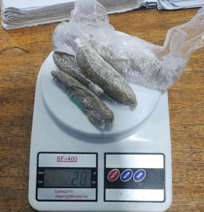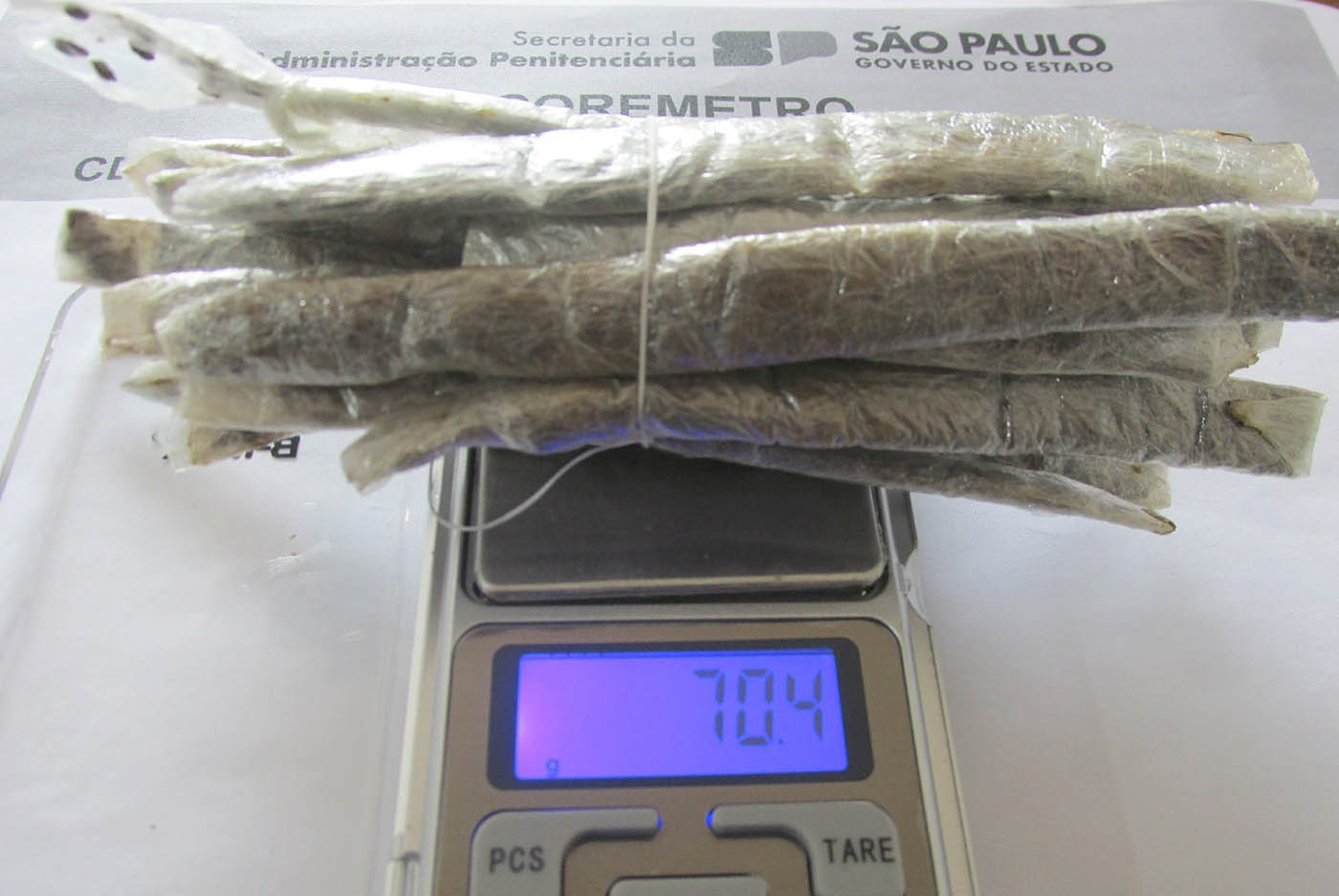 Na segunda-feira, dia 23, quando da revista nos itens enviados via correspondência, os servidores tiveram êxito em localizar ilícitos em formato de barra que estava introduzidos nas barras das calças que foram enviadas por familiares constantes no rol de visitas. Foram apreendidas nove barras, num total de 70,4 gramas.